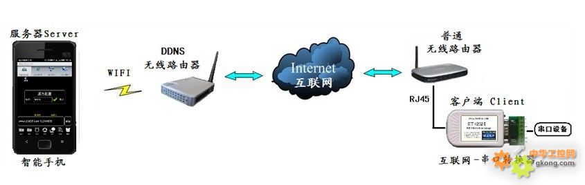 智能手機(jī)接的必須是帶DDNS的無(wú)線路由器,特點(diǎn)就是帶固定域名,這個(gè)固定域名永遠(yuǎn)指向本DDNS無(wú)線路由器的互聯(lián)網(wǎng)(外網(wǎng)或者稱為WAN口)IP地址。DDNS無(wú)線路由器具有普通的無(wú)線路由器的全部功能。遠(yuǎn)端上網(wǎng)可以用普通的無(wú)線路由器即可,這個(gè)普通無(wú)線路由器的LAN網(wǎng)口用RJ45網(wǎng)線接波仕ETH232I型號(hào)的互聯(lián)網(wǎng)-串口轉(zhuǎn)換器,ETH232I帶的串口(RS-232、RS-485、RS-422)可以接串口設(shè)備。