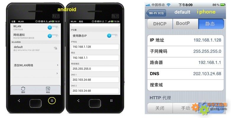 2.1、將智能手機(jī)的無(wú)線IP設(shè)置為靜態(tài)IP地址。在無(wú)線WIFI的高級(jí)選項(xiàng)里選擇“使用靜態(tài)IP地址”。網(wǎng)關(guān)為DDNS無(wú)線路由器的內(nèi)網(wǎng)LAN口IP地址192.168.1.1(寫在DDNS無(wú)線路由器的外殼上)。這里IP地址比如設(shè)置為192.168.1.128,注意前3位必須與DDNS無(wú)線路由器的內(nèi)網(wǎng)IP地址的前3位一樣。網(wǎng)絡(luò)前綴長(zhǎng)度為24(即:24位2進(jìn)制數(shù))。“DNS1”和“DNS2”請(qǐng)上網(wǎng)搜索當(dāng)?shù)氐挠蛎馕龇⻊?wù)器IP地址,圖中的202.103.24.68是武漢電信的。在ipad的設(shè)置項(xiàng)中,24位2進(jìn)制數(shù)相當(dāng)于子網(wǎng)掩碼255.255.255.0,“DNS1”和“DNS2”統(tǒng)稱為“DNS”,其余一樣。