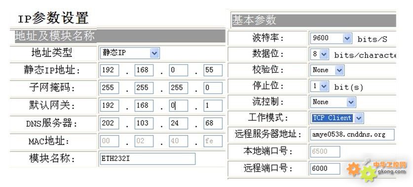 靜態(tài)IP地址就是ETH232I的IP地址,可以修改。默認(rèn)網(wǎng)關(guān)就是產(chǎn)品所接的無(wú)線路由器的內(nèi)網(wǎng)IP地址(寫在路由器的外殼上)。DNS服務(wù)器上當(dāng)?shù)氐幕ヂ?lián)網(wǎng)域名解析的服務(wù)器,比如武漢電信為202.103.24.68,其它地方的DNS地址請(qǐng)到互聯(lián)網(wǎng)上查詢。串口設(shè)置可以設(shè)置串口的速率、格式。工作模式選擇:TCP Client。遠(yuǎn)程服務(wù)器地址就是DDNS無(wú)線路由器內(nèi)置的固定域名。遠(yuǎn)程端口號(hào)可以就用6000,本地端口號(hào)可以就用6500。