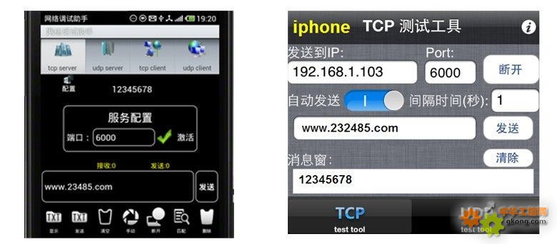 以上的設(shè)置都正確后就可以進(jìn)行互聯(lián)網(wǎng)串口通信了。在Android智能手機(jī)上安裝TCP-TEST.APK(TCP網(wǎng)絡(luò)調(diào)試助手),運(yùn)行TCP網(wǎng)絡(luò)助手,選中“tcp server”,鍵入端口(6000),按“激活”即可。在蘋果iphone手機(jī)上安裝TCP/UDP測(cè)試工具,使用方法是一樣的。