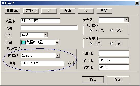 注意:數據庫指定部分,數據源指定為要訪問的數據源Remote,參數指定為其在Remote數據庫中的點參數名稱PT1154.PV。