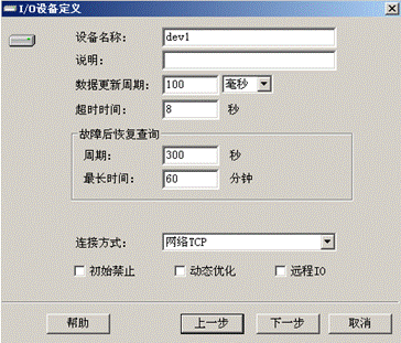 設備驅動組態: 首先,在紫金橋開發系統的“數據庫”選項卡中,展開節點“設備驅動-〉PLC-〉Panasonic(松下)”,然后雙擊“DLU-MEWTOCOL/TCP(FP系列..)”,在彈出的“I/O設備定義”對話框中填寫基本的設備通訊參數,如下圖: