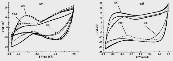 半徑小的電解液離子更易于向孔內(nèi)遷移,擴(kuò)散雙電層的結(jié)構(gòu)特征不明顯,雙電層電容得以提高.然而,水相體系中,離子大多以水化的形式存在,因此,水化離子大小決定了形成雙電層的離子有效半徑.離子的水化主要取決于離子的大小及與H_20分子間作用力的強(qiáng)弱.離子越小,與H 0分子間作用力越強(qiáng),離子水化越趨嚴(yán)重.圖4為樣品at0和中孔炭at25在0.2 mol·L的LiC1、NaC1和KC1電解液中測(cè)得的CV曲線.可以看出,樣品at0的孔徑與離子大小接近,對(duì)離子的尺寸更為敏感,“分子篩”的作用表現(xiàn)明顯.在陽(yáng)離子進(jìn)行吸脫附的負(fù)極極化區(qū),CV曲線表現(xiàn)出較大的差別.由于水合離子的大小順序?yàn)長(zhǎng)i >Na >K ,負(fù)極極化區(qū)的電容以在KC1溶液中所測(cè)最高,并與正極極化區(qū)的電容相近,CV曲線最為對(duì)稱,說(shuō)明cl一與 由于離子大小及與H20分子間的作用力近似,因此具有相同的水化機(jī)制和水化程度.而表現(xiàn)cl一吸脫附的正極極化區(qū),在NaC1和KC1溶液中所測(cè)的CV曲線基本重合;在LiC1溶液中,充、放電容量有所減小,這可能是由于Li 的離子半徑過(guò)小,水化作用非常強(qiáng),Li 水化離子對(duì)水化陰離子Cl一在炭電極表面的吸附也造成了一定影響,使正極極化區(qū)的充放電容量降低.中孔炭at25的孔徑大,水化離子進(jìn)出的阻力大為降低,負(fù)極極化區(qū)充、放電容量的差別縮小,離子水化對(duì)雙電層電容的影響顯著減弱,但仍以KC1溶液中所測(cè)電容最高;且與樣品atO相比,稀溶液中,在PZC點(diǎn)雙電層的擴(kuò)散減弱,微分比電容曲線的凹點(diǎn)已表現(xiàn)不明顯.