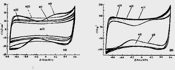 (2)炭電極的單位面積微分比電容高,僅表明孔表面利用率高.多孔炭電極既有高的孔表面利用率,又有大的比表面積,方可獲得高的電容量.