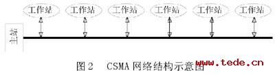 隨機(jī)接入共享信道的特點(diǎn)是所有用戶都可以根據(jù)自己的意愿隨機(jī)地發(fā)送信息。實(shí)際上就是爭用接入,征用勝利者才能獲得總線,從而發(fā)送自己的信息。典型的隨機(jī)接入是載體偵聽多重訪問/沖突檢測(CSMA/CD)網(wǎng)絡(luò),其為總線型結(jié)構(gòu),如圖2所示。后文重點(diǎn)介紹的基于CEbus的擴(kuò)頻載波線性掃頻信號(hào)(Chirp)由于具有自相關(guān)性,所以適用于CSMA網(wǎng)絡(luò)。結(jié)合電力線的傳輸特性,綜合比較各種網(wǎng)絡(luò),在本文所要開發(fā)的遠(yuǎn)抄系統(tǒng)中選用CSMA協(xié)議應(yīng)該是比較合適的。CSMA協(xié)議網(wǎng)絡(luò)的缺點(diǎn),如時(shí)延不確定、重載時(shí)效率下降,對(duì)數(shù)據(jù)傳輸量較小的遠(yuǎn)程抄表系統(tǒng)來講,并不是值得考慮的問題。