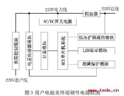 用戶電能表終端由AC/DC開關(guān)電源模塊、電量傳感器模塊、故障保護(hù)模塊、計(jì)量模塊、負(fù)荷控制模塊、LED顯示模塊、MCU系統(tǒng)模塊、低壓擴(kuò)頻載波通信模塊構(gòu)成,圖3是用戶電能表終端硬件電路框圖。