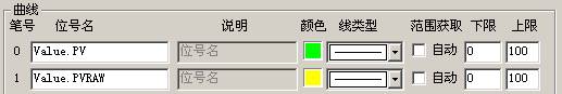 為了方便的觀看量程轉換的結果,我們使用實時趨勢組件來顯示轉換前和轉換后的曲線圖。將導航器切換到畫面頁,雙擊“窗口”項創建一個名為Draw1的窗口。點擊工具條按鈕  ,在隨后彈出的子圖選擇對話框中,雙擊“趨勢分析/實時趨勢”組件,在窗口中創建該組件。雙擊實時趨勢組件,彈出設置對話框,在“曲線”頁上,在0號筆的位號編輯框中填入Value.PV,在1號筆的位號編輯框中填入Value.PVRAW,同時取消這兩支筆的范圍獲取自動選項,如下圖所示: