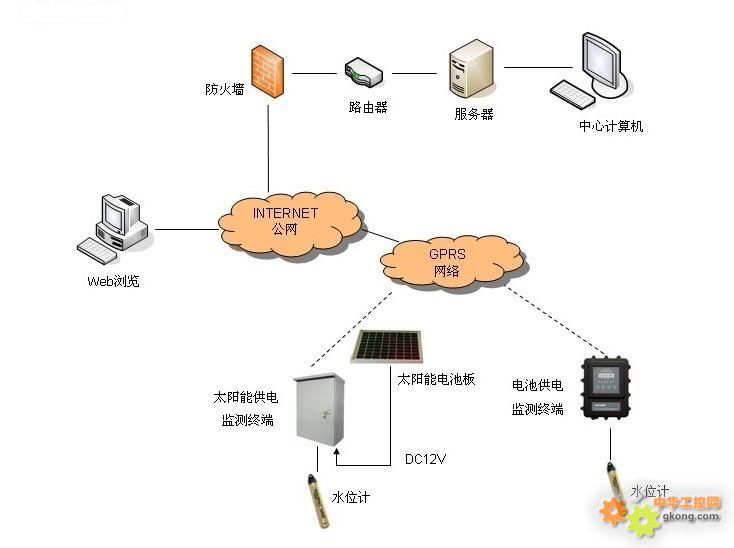 1、概述 地下水資源較地表水資源復雜,因此地下水本身質和量的變化以及引起地下水變化的環境條件和地下水的運移規律不能直接觀察,同時,地下水的污染以及地下水超采引起的地面沉降是緩變型的,一旦積累到一定程度,就成為不可逆的破壞。因此準確開發保護地下水就必須依靠長期的地下水監測,及時掌握動態變化情況。 2、系統解決方案 2.1系統概述 該系統依托中國移動公司GPRS網絡,工作人員可以在監測中心遠程查看地下水的水位數據。監測中心的監測管理軟件能夠實現數據的遠程采集、遠程監測,監測的所有數據進入數據庫,可以生成各種報表和曲線。 2.2系統組成 地下水位動態監測系統由四部分組成:監測中心、通信網絡、水位監測終端、水位計。 2.3系統拓撲圖
