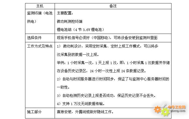 2.5通訊網絡 中國移動的GPRS網絡信號覆蓋范圍廣、數據傳輸速率高、通信質量可靠、誤碼率低、運行穩定、數據傳輸實時性、安全性和可靠性高、安裝調試簡單方便,按信息流量計費,用戶使用成本比較低。 本系統通信網絡采用中國移動公司GPRS網絡和Internet公網。要求監控中心具備寬帶(類型:光纖、網線、ADSL等),并具有一個Internet網絡上的固定IP。 監測點測控終端內部配置GPRS無線數據傳輸模塊,模塊內安裝一張開通GPRS功能的SIM卡。測控終端通過其內部的GPRS無線數據傳輸模塊與監控中心服務器組成一個通信網絡,實現系統的遠程數據傳輸。 網絡運行費用: 監測中心:需支付寬帶使用費用,具體費用標準請在當地相關部門咨詢。 監測點現場:每個監測點的SIM卡的通訊費用(數據通信費,以河北為例,具體收費標準請咨詢當地移動公司)。 子站:5元/月(30M) 子站每月總通信費:5*現場監測點數量 2.6現場監測點水位監測終端 根據地下水監測現場環境多樣的特點,水位監測終端設計了三種供電方式,分別為:市電供電(現場有AC220V電源)、太陽能供電和鋰電池組供電。其中市電供電和太陽能供電方式能夠滿足數據上報比較頻繁的要求,數據上報要求不頻繁時可使用鋰電池組供電方式。 2.6.1鋰電池組供電方案 適用于沒有站房的監測井,內置1組鋰電池組作為工作電源,特別適合于沒有外部電源供電的現場環境,微功耗設計,鋰電池組可以正常工作2-5年。 ※注:電池有效壽命為5年,實際使用壽命大于1萬次無線通訊.