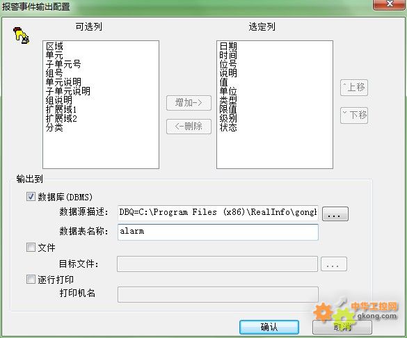 其次,在窗口的下半部分是將報警記錄輸出到目標數據庫或文件的設置。這里我們先選擇輸出到數據庫,先將數據庫選項勾選上,然后配置數據源及導出的數據表的名稱,數據表名稱可以自由填寫,系統會自動建立。最后點擊確認完成配置。