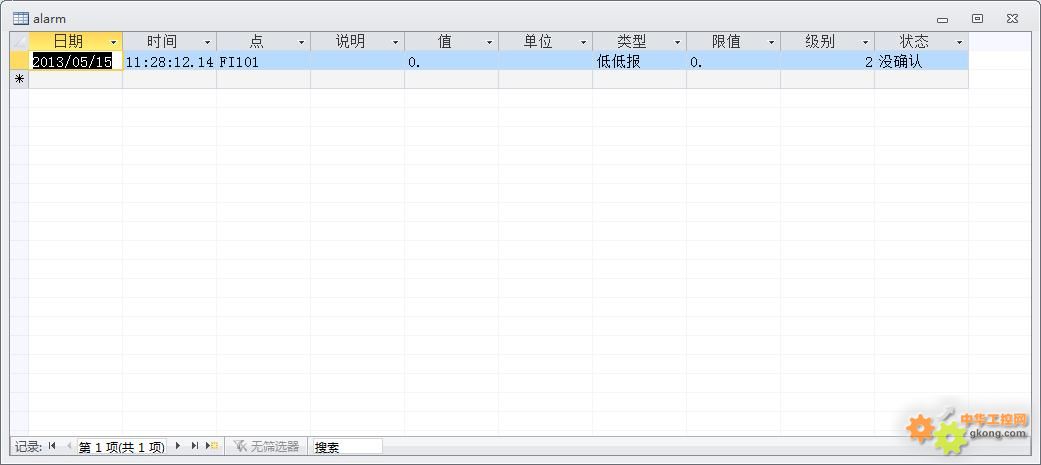 軟件的配置工作到此就完成了,下面我們把軟件運行起來看一下效果。因為我們設置點的低低限報警值為0,在軟件啟動時該點的默認值為0,這時會產生一個低低限報警。我們打開剛才建立的數據表,如下圖所示: