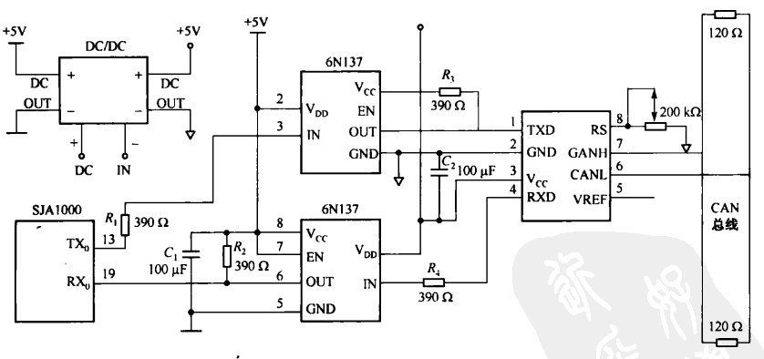 光電隔離電路雖然能增強系統的抗干擾能力,但也會增加CAN總線有效回路信號的傳輸延遲時間,導致通信速率或傳輸距離減少。82C250等型號的CAN收發器本身具備瞬間抗干擾,降低射頻干擾(RFI)及實現熱防護的能力,其具有的電流限制電路還提供了對總線的進一步保護功能,因此,如果現場傳輸距離近,電磁干擾小,可以不采用光電隔離,應選用高速光電隔離器件。以縮短CAN總線有效回路信號的傳輸延遲時間,如高速光電耦合器6N137,傳輸延遲時間短,典型值僅為48NS,已接近TTL電路傳輸延遲時間的水平。