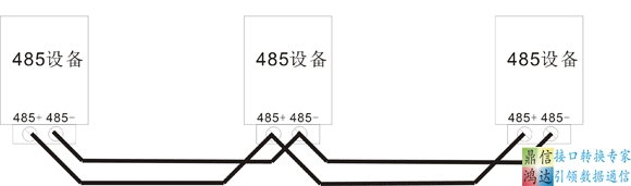 總線型拓撲結構:總線型拓撲結構是485總線布線的標準敷設方式,其主控設備與多個從控形成手牽手的菊花鏈連接方式,即:假設整個485總線上有A,B,C,D,E多個設備,其接線方式是,將A的485+接到B的485+接口上,再從B的485+上面再引一條線接到C的485+上面,以此類推,一直接到E的485+接口上面,485-的接線方式和485+的接線方式類似,相關情況可以參考下面的圖示: