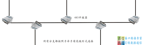 樹形拓撲結構:其實總線型拓撲結構就是一種特殊的樹形拓撲結構,只不過總線型拓撲結構的分支距離幾近于零,而485總線在通信時,如果有分支并且超過一定距離的話,就會形成信號反射,從而導致485信號相互干擾,導致信號變弱甚至于出錯,導致整個系統(tǒng)通信質量大大下降,將485中繼器接在分支上,將分支與主干線相互隔離,使其沒有信號反射問題,從而可以使得485總線可以實現(xiàn)樹形拓撲結構,相關情況可以參考下面圖示: