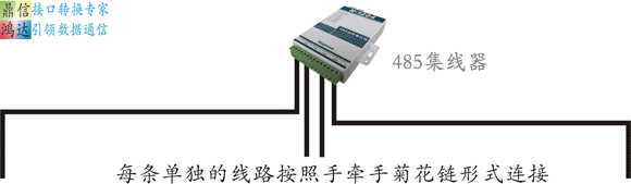 星型拓撲結構:星型拓撲結構是485總線使用得比較多的接線方式,由于485總線上的設備相對比較分散,而且主控設備一般作為主控室大多都位于中心位置,星型拓撲結構是很多施工方選擇的接線方式,星型拓撲結構必須要借助485集線器才可以做到,相關情況可以參考下面的圖示: