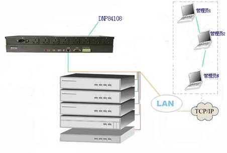 當(dāng)服務(wù)器或網(wǎng)絡(luò)設(shè)備死機(jī),為了重啟設(shè)備我們通常要循環(huán)開啟、關(guān)閉設(shè)備。如果設(shè)備不在當(dāng)?shù)兀敲催@個重啟的過程就會很麻煩且代價很高。智能PDU/84108為我們提供了可靠的、有效的方法,對于支持WOL功能的PC、服務(wù)器可實(shí)現(xiàn)異地遠(yuǎn)程重啟的操作,省去管理員因?yàn)橹貑⒍速M(fèi)的時間和人力以及服務(wù)器和PC宕機(jī)時間延長產(chǎn)生的損失,提高網(wǎng)絡(luò)運(yùn)行效率。下圖為DNP84108在機(jī)房監(jiān)控中的應(yīng)用方案: