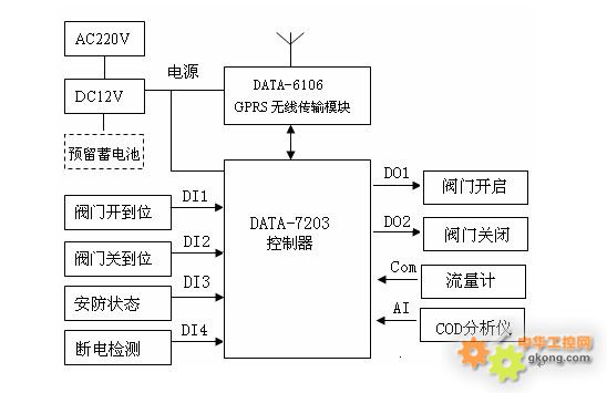 5.1、污水排放測控終端主要功能 ◆ 采集COD在線分析儀和污水流量計輸出的RS232/RS485串口信號或4~20mA摸擬量信號。 ◆ 采集電動閥門的開到位、關到位狀態。 ◆ 就地顯示污水COD含量和瞬時、累計污水排放量等實時監測數據。 ◆ 遠程控制電動閥門的開啟和關閉。上位機監控軟件發出開、關命令,測控終端完成控制操作。 ◆ 支持IC卡充值管理功能,通過IC卡可對測控終端內控制器進行充值管理。監測點費用消耗完畢后,測控終端自動關閉電動閥門,停止排污。 ◆ 支持設定污水COD上限值,COD監測數據越上限時測控終端自動停閥,停止排污 ◆ 支持GPRS遠程充值功能。 ◆ 測控終端箱門被打開狀況發生時,立即上報告警信息。 ◆ 支持就地、遠程設備維護。 ◆ 支持擴展酸度、堿度、濁度、PH等監測功能。 ◆ 根據監測環境,可選擇室內型或室外型測控終端箱。 ◆ 預留蓄電池接口,接入蓄電池后可實現斷電報警功能。 5.2、污水排放測控終端原理示意圖