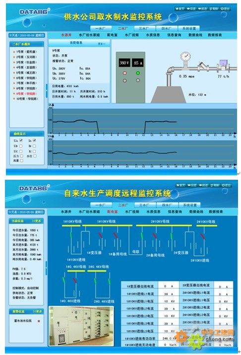 3、自動化監控系統主要功能 ◆ 系統可以實時監測水源井水泵工作情況,包括:電流、電壓、電能、泵開關狀態、保護狀態、出水壓力、出水流量。可以遠程起停水源井水泵。 ◆ 系統可以實時監測進廠流量、出廠流量、出廠壓力、水池水位、余氯等信息。 ◆ 系統可以實時監測加氯機的工作狀態、加氯速度、自動控制/遠程控制加氯機的起停。 ◆ 系統可以實時監測加壓泵組水泵的工作狀態,包括:開關狀態、保護狀態、電壓、電流、頻率等。 ◆ 系統可以自動控制、遠程控制加壓泵的起停。根據出口壓力自動調整水泵轉速。 ◆ 系統可以實時監測配電站信息,包括:開關狀態、電流、電壓、電能等。 4、 典型操作界面