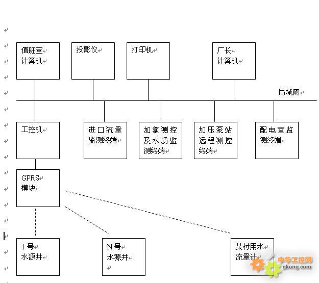 一、概述: 為解決農(nóng)村飲水安全問(wèn)題,很多地方建立了小型水廠,集中為一些村鎮(zhèn)供水。農(nóng)村水廠自動(dòng)化與配電是水廠建設(shè)中的重要部分,以下對(duì)該部分內(nèi)容做簡(jiǎn)要介紹。 二、農(nóng)村集中供水形式: 各地根據(jù)自身的水資源及地勢(shì)情況確定供水形式,主要包括以下幾種: 1、直供井供水:每個(gè)村鎮(zhèn)打一眼或多眼深井,直接通過(guò)管網(wǎng)為村鎮(zhèn)供水。 2、一眼或多眼水源井取地下水,進(jìn)入小型水廠,加氯,進(jìn)入清水池,再通過(guò)幾套加壓泵為不同村鎮(zhèn)供水;有的小型水廠清水池地勢(shì)較高,可通過(guò)自流為不同的村鎮(zhèn)供水。 3、一個(gè)或多個(gè)取水泵站取地表水,進(jìn)入小型水廠后,經(jīng)加藥加氯等工藝處理進(jìn)入清水池,再通過(guò)幾套加壓泵為不同村鎮(zhèn)供水;有的小型水廠清水池地勢(shì)較高,可通過(guò)自流為不同的村鎮(zhèn)供水。 三、農(nóng)村水廠自動(dòng)化解決方案 以第二種供水形式為例介紹水廠自動(dòng)化系統(tǒng)。多眼水源井取地下水,原水進(jìn)入小型水廠,加氯,進(jìn)入清水池,再通過(guò)幾套加壓泵為不同村鎮(zhèn)供水。 1、總體方案設(shè)計(jì) ◆ 在水源井井房?jī)?nèi)安裝水源井遠(yuǎn)程測(cè)控終端。 ◆ 在水廠進(jìn)水口安裝流量監(jiān)測(cè)終端。 ◆ 在水廠加氯間安裝加氯設(shè)備遠(yuǎn)程測(cè)控及水質(zhì)監(jiān)測(cè)終端。 ◆ 在水廠加壓泵房安裝加壓泵站遠(yuǎn)程測(cè)控終端。 ◆ 在水廠低壓配電室安裝配電監(jiān)測(cè)終端。 ◆ 在水廠值班室安裝工控機(jī)、計(jì)算機(jī)、投影儀、打印機(jī)等。安裝監(jiān)控系統(tǒng)軟件。 ◆ 流量監(jiān)測(cè)終端、加氯設(shè)備遠(yuǎn)程測(cè)控及水質(zhì)監(jiān)測(cè)終端、加壓泵站遠(yuǎn)程測(cè)控終端與值班室工控機(jī)之間采用局域網(wǎng)有線通信方式;水源井遠(yuǎn)程測(cè)控終端與值班室工控機(jī)之間采用GPRS無(wú)線通信方式(支持光纖通信方式)。 ◆ 未來(lái),水廠需要對(duì)各用水單位進(jìn)行流量監(jiān)測(cè),采用GPRS無(wú)線通信方式。 2、系統(tǒng)拓?fù)鋱D