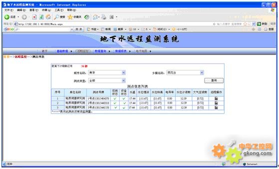 ---監控中心--- 1.中心軟件系統概述 該軟件是地下水監測系統專用軟件,采用B/S結構,由系統管理員負責管理,領導者或其它工作人員經授權后可在自己的計算機上通過局域網訪問服務器,可進行權利范圍內的操作。如果需要,該軟件可以在INTERNET公網上發布,被授權者在任何地方的計算機上都可以通過INTERNET公網訪問和操作該系統。 該軟件采用模塊結構,主要包括兩大模塊:一個是人機界面、另一個是通訊前置機。每個模塊又由若干小模塊組成。通訊前置機軟件主要負責監控中心與現場設備的通信,它具有強大的兼容性,可支持任何廠家生產的GPRS、CDMA、MODEM、RS485等通信產品,支持多種通信方式共存一個系統。人機界面包括基礎數據管理、遠程操作、人工錄入、數據查詢、數據報表、數據分析、地圖管理等多項內容,可根據不同客戶的不同需求設計組合成個性化的監控與管理系統軟件。 2.監測中心配置 硬件: 中心具備寬帶網絡(類型:光纖、網線、ADSL等),并綁定固定IP。 一臺專用計算機,放在機房,作為固定IP服務器,將服務器操作系統和數據庫軟件和系統監控軟件裝在里面,存貯數據,保證其24小時在線。 軟件: 操作系統軟件:推薦Windows 2003 Server with sp2 數據庫軟件:推薦Microsoft SQL Server 2000 SP4,作為系統后臺數據庫的軟件平臺。 地下水監測系統軟件:完成遠程數據的接收、顯示、存儲和統計分析等功能。 3.地下水監測管理系統軟件功能介紹 ◆ 軟件主界面 開機界面顯示地圖,地圖上每個地下水監測點的位置以圓點顯示,紅色代表故障,綠色代表正常,鼠標放置圓點位置時,顯示該測點的水位、水溫等數據。