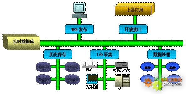 在本系統中,實時數據庫的主要功能是發揮其作為一種高效、穩健的信息橋梁的作用,為設備診斷和在線工藝優化等上層應用程序和底層控制設備之間鋪設一條快速、及時、準確地雙向數據通路,提供一個完整、穩定、開放性好的數據支持平臺。