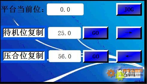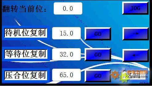 該設備分為兩部分:伺服電機通過絲桿傳動控制平臺的定位,步進電機則控制翻轉臺。工作模式分自動,手動,寸動三種,手動模式下通過PLC定位指令實現設備定位,在自動模式下第一次操作點啟動,平臺和翻轉臺找原點之后運行到待機位,之后進行壓合動作,執行完一系列動作后,平臺和翻轉臺各自回待機位等待下一次啟動。寸動模式下,則是在HMI上面點擊一下控制位,電機旋轉一定角度。在HMI上面還實時顯示平臺和翻轉臺的當前位置,設置電機轉速等。