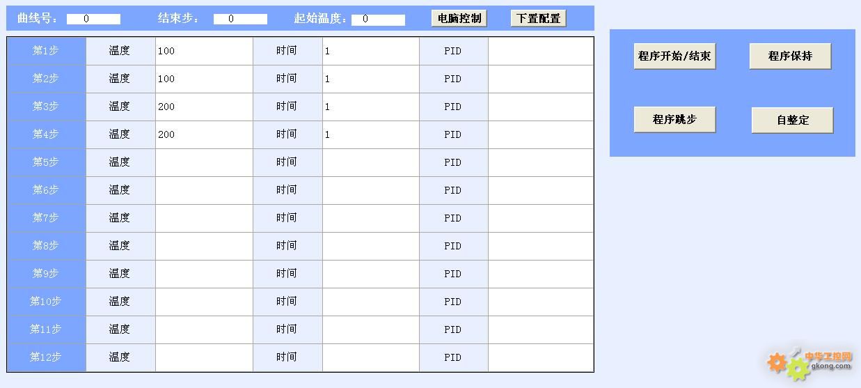 參數(shù)配置:當前調(diào)節(jié)的曲線號、結(jié)束步、起始溫度都可以設(shè)置,每一步的溫度、時間以及PID參數(shù)都可以按照預(yù)定的方案設(shè)置。