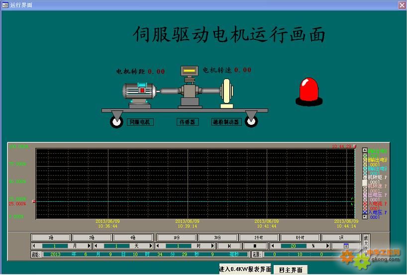 伺服驅動電機運行界面:伺服驅動電機模擬動態畫面顯示,實時顯示電機轉矩及電機轉速,也可進行數據設定,并提供趨勢曲線,可實時瀏覽電流、電壓、轉矩等數據的實時曲線,也支持歷史曲線查詢,可以隨時增加或刪除曲線,并可以通過該界面進入實時報警界面和報表界面。