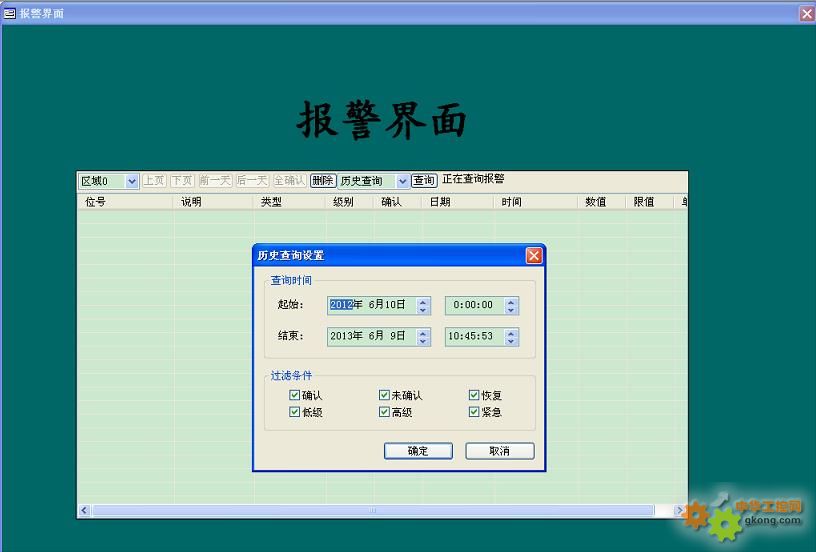 報警界面:顯示實時報警信息、歷史報警信息,同時也可以根據用戶所需條件查詢歷史報警信息,也可以按區域進行報警顯示或查詢,方便用戶實時的了解設備的故障狀態信息,以便及時做出相應的調整工作。