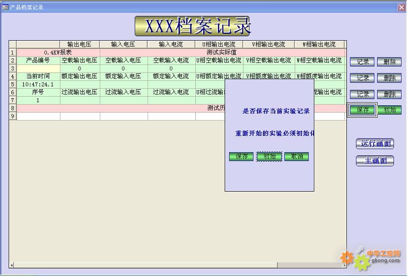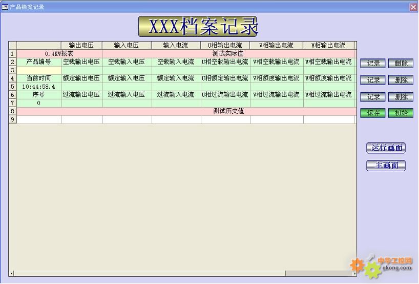 報表界面:實時顯示輸入輸出電壓、電流等數據,也可顯示測試的歷史值,對測試的數據做記錄、刪除、保存等處理,是本系統的核心部分,用戶主要就是根據該測試的數據,做伺服驅動器的故障判斷和性能分析。