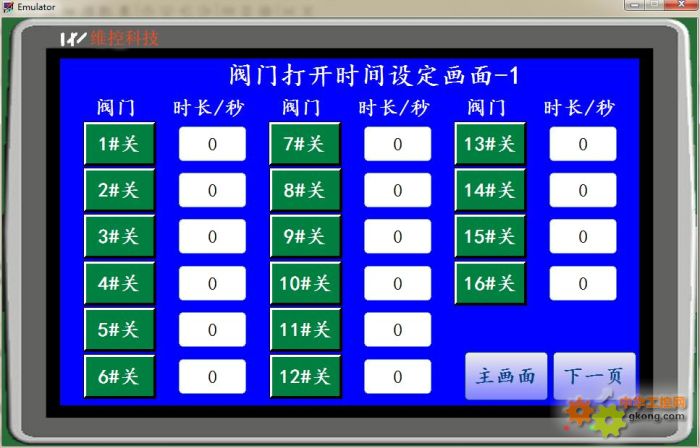維控觸摸屏與維控PLC以及16路輸出模塊共同構成控制系統,一共控制32路閥門注水。控制系統可以選擇手動和自動注水。自動注水可以先設定開啟的閥門,注水時間,和定時的時間,等時間到的時候,注水系統就自動運行。自動注水只需要設定開啟的閥門和注水時間,再按強制啟動即可。