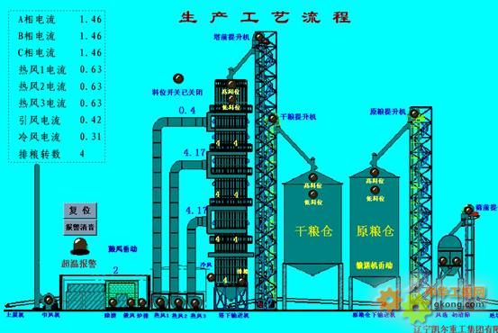 在我國,每年需要處理的高水分糧食高達(dá)1億多噸,占總產(chǎn)量的四分之一。長期以來,國家要拿出大量的資金財(cái)力.對高水分糧食進(jìn)行干燥處理。糧食干燥已經(jīng)成為制約我國糧食產(chǎn)后處理和增值的瓶頸。開發(fā)和推廣糧食干燥設(shè)備已是大勢所趨,紫金橋作為配套上位機(jī)軟件用于實(shí)現(xiàn)生產(chǎn)工藝流程事實(shí)監(jiān)控、歷史數(shù)據(jù)的存儲(chǔ)和查詢、報(bào)表的打印、實(shí)時(shí)報(bào)警等功能。下面以一個(gè)實(shí)際應(yīng)用案例為例來給大家介紹一下紫金橋軟件在糧食干燥系統(tǒng)中的應(yīng)用。 在此處例舉的糧食干燥系統(tǒng)是一個(gè)以干燥玉米為主,日處理量可達(dá)500噸的大型系統(tǒng),這一系統(tǒng)采用糧食烘干塔通過熱風(fēng)烘干,干燥工藝一次降水率達(dá)14%,在整個(gè)工藝流程中原糧經(jīng)過圓篩篩選、風(fēng)選、通過原糧提升機(jī)進(jìn)入原糧倉儲(chǔ)存,再由輸送機(jī)經(jīng)由塔前提升機(jī)進(jìn)入烘干塔,原糧在這里利用熱風(fēng)烘干通過冷風(fēng)降溫,最后進(jìn)入干糧倉。紫金橋軟件負(fù)責(zé)對這一過程的實(shí)時(shí)監(jiān)視和控制,同時(shí)包括對熱風(fēng)產(chǎn)生過程、各個(gè)風(fēng)機(jī)的啟停的監(jiān)控。工藝流程如下圖所示: