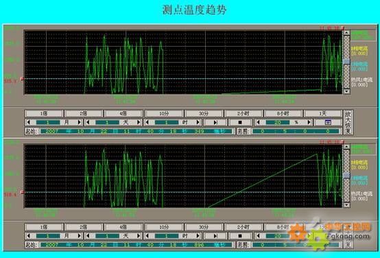 歷史趨勢的查詢是本系統(tǒng)的一個(gè)重要功能,通過歷史趨勢組件可以查詢各個(gè)電機(jī)電流以及多個(gè)測點(diǎn)溫度的變化趨勢。歷史趨勢可以查看任意時(shí)段的歷史數(shù)據(jù)、多個(gè)點(diǎn)可以顯示在一張圖表中,便于對比。