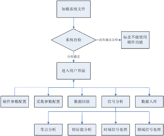 軟件主要功能包括硬件參數(shù)設(shè)置、采集參數(shù)設(shè)置、時(shí)域信號(hào)分析、頻域信號(hào)分析、零點(diǎn)處理、傳感器校準(zhǔn)等。軟件流程圖如下: