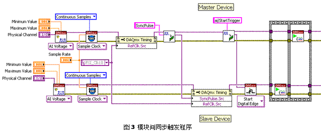以一塊主板卡、一塊從板卡為例,以上同步觸發(fā)工作通過LabVIEW編程實現(xiàn)的代碼如圖3: