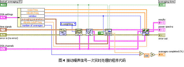齒輪箱測試試驗標(biāo)準(zhǔn)要求試驗過程中每隔15分鐘進行一次振動噪聲信號采集和實時頻域傅立葉分析,關(guān)心的頻率分辨率為0.5Hz,帶寬為20kHz,16次譜平均,對于振動信號需要進行頻帶能量計算,噪聲信號需要進行等效聲壓級計算。這就要求我們每次計算對時域振動噪聲信號以80kS/s采樣率采集2秒,連續(xù)進行16次采集及計算。一次實時處理的程序代碼如圖4所示。