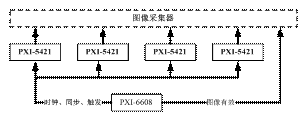 硬件信號連接如圖2所示。PXI-6608是一款8通道的計數(shù)器/定時器模塊,其內(nèi)部時鐘精度可達(dá)75ppb,在本系統(tǒng)中主要用于產(chǎn)生時鐘信號、圖像有效信號及系統(tǒng)內(nèi)部用于同步和觸發(fā)的輔助信號。