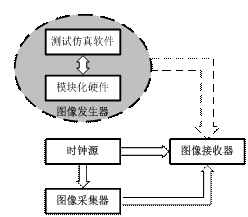 目前,圖像接收器已完成初步設(shè)計,為降低系統(tǒng)設(shè)計的風(fēng)險和成本,采用硬件在環(huán)仿真技術(shù)對圖像接收器進(jìn)行測試,并在測試成功后繼續(xù)仿真圖像采集器的輸出數(shù)據(jù),以模擬產(chǎn)生某些實(shí)驗(yàn)條件。其原理如圖1虛線部分所示。模塊化硬件結(jié)合測試仿真軟件組成圖像發(fā)生器,用于仿真時鐘源和圖像采集器的實(shí)際功能,產(chǎn)生各種時鐘和圖像信號。