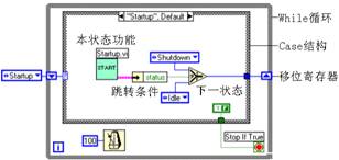 - 狀態(tài)遷移圖是一種特殊類型的程序流程圖,在使用LabVIEW編程時,它是設(shè)計狀態(tài)機(jī)(State Machine)結(jié)構(gòu)的有效工具。在實(shí)現(xiàn)一個比較復(fù)雜的任務(wù)時,如果可以將該任務(wù)劃分為幾個簡單的任務(wù),并且這些任務(wù)之間可以根據(jù)一定的條件相互跳轉(zhuǎn),在LabVIEW中我們通常會使用狀態(tài)機(jī)結(jié)構(gòu)。在LabVIEW中,一個基本的狀態(tài)機(jī)結(jié)構(gòu)包括了While循環(huán),Case結(jié)構(gòu)和移位寄存器,如圖3所示。
