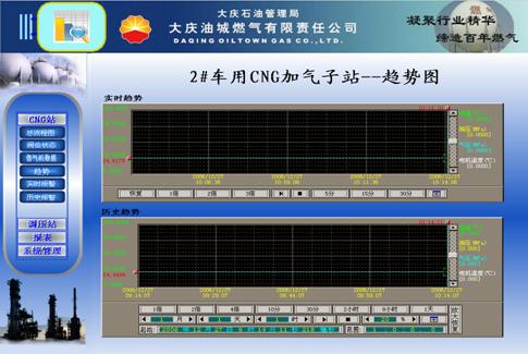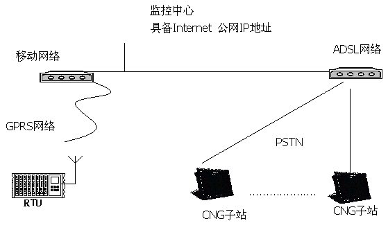 調壓站以RTU為核心組成的現場數據采集監控系統,通過GPRS的方式上傳給生產調度指揮中心。CNG子站通過ADSL和監控中心相連。調度中心通過人機界面系統完成對分布在全市范圍內的CNG加氣站和調壓箱實現數據通訊、全部生產數據監控采集。每天24小時不間斷地對各監控站的監測參數進行顯示并實現報警記錄、事件記錄以及主要的生產數據進行存儲與歸檔處理、報表輸出等管理功能。