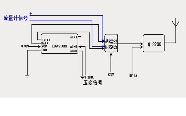 由于調壓站的位置偏僻,架設專用線路的費用較高,這里可以使用無線通訊的方式,通過無線模塊將數字信號通過GPRS網絡傳送到遠程的計算機。需要注意的是流量計和模擬輸入模塊的波特率應設置一致。下圖為簡易接線圖。