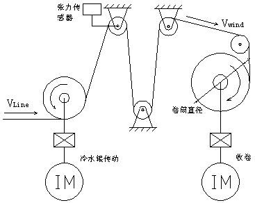 如圖一所示,LSR800熱定型機收卷機前級為冷水輥,采用Danfoss VLT AutomationDrive FC301系列驅動器,恒速度控制,電機上裝有編碼器,既用作冷水輥驅動器的速度反饋,又可以作為收卷控制的織物線速度前饋檢測。收卷卷筒空筒時直徑170毫米,滿筒時為1400毫米,卷徑變化約8倍。收卷卷筒采用Danfoss Automation FC302系列高性能驅動器,加裝中心卷繞卡。中間裝有張力檢測輥。