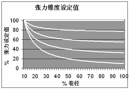 有了卷筒直徑,就能根據張力和錐度設定給出張力錐度的設定值。丹佛斯中心卷繞卡的張力錐度設定值變化曲線如圖四,當張力錐度設為0時,表示恒張力,張力設定值與卷徑無關;當張力錐度設為100%時,表示恒轉矩,卷徑每增加一倍張力就減小一半。