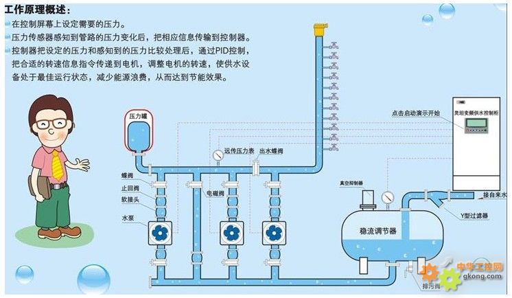 無(wú)負(fù)壓供水設(shè)備采用了全自動(dòng)智能控制技術(shù),具有多種保護(hù)和控制功能,可實(shí)現(xiàn)真正的無(wú)人值守。用水泵和自來(lái)水管網(wǎng)直接連在一起,用壓力調(diào)節(jié)罐作為水泵進(jìn)水儲(chǔ)水的裝置,采用真空消除器消除管網(wǎng)內(nèi)所產(chǎn)生的負(fù)壓,在充分利用自來(lái)水管網(wǎng)提供的供水原有壓力上,給水進(jìn)行二次加壓。無(wú)負(fù)壓供水設(shè)備即實(shí)現(xiàn)了增壓的目的,又節(jié)省建水池,水箱的投資,在保證管網(wǎng)水質(zhì)的同時(shí)(無(wú)二次污染),又可充分利用管網(wǎng)的原有水壓,其節(jié)能效果極其顯著,可達(dá)50%以上。