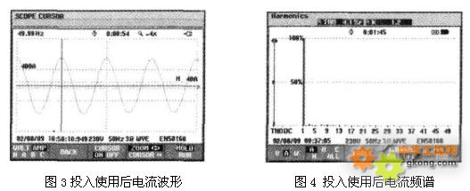 投入有源電力濾波器后,變頻器電網供電的波形及諧波含量均發生了變化,從圖3可以看出電流波形已變得接近正弦波,圖4中反映出變頻器的總輸入電流總畸變率減少到4.1%,5次諧波電流從原來的135A變為17A,7次諧波電流從原來的78A變為7A,其他次數的諧波同樣得到了消除。有源電力濾波器的應用為企業消除電網污染、節能降耗帶來了新的亮點。