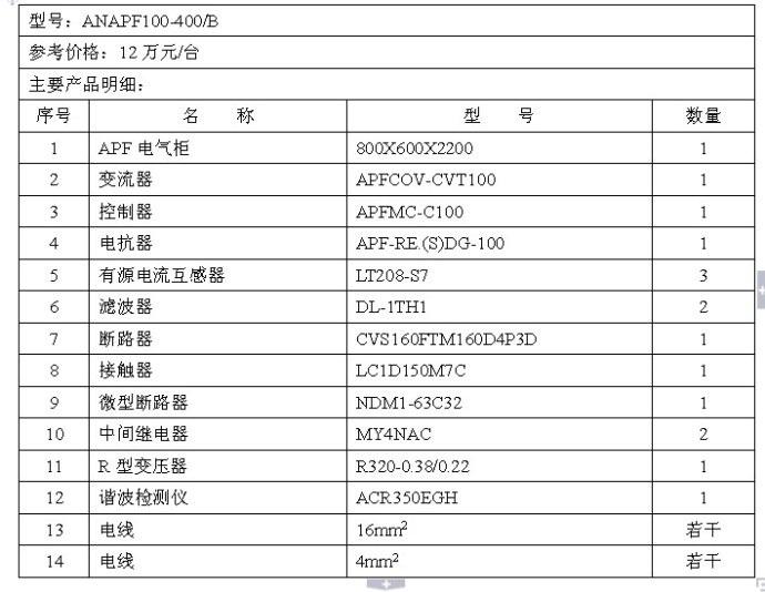 據(jù)反饋,自有源濾波器投運至今,裝車吊機運行故障率明顯降低,變頻器故障發(fā)生率由平均每月3-4次降到了每半年1次;皮帶秤故障由每月1次到不再出現(xiàn)故障。大大提高了裝車吊機運行的穩(wěn)定性和工作效率。 4.3 ANAPF有源濾波器報價及主要元件清單