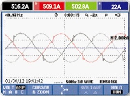 圖2中的電流波形已經(jīng)基本看不出是正弦波而是較為典型的M波。結(jié)合圖4中電流諧波含量數(shù)據(jù)可分別計算出A相、B相、C相電流值為270A、261.6A、283.6A,同時三相電流的諧波畸變率均超過50%,查閱國標GB T14549-1993《電能質(zhì)量 公用電網(wǎng)諧波》,本系統(tǒng)的諧波電流均已超過基準短路容量所允許的諧波電流限制。綜合電壓及電流數(shù)據(jù),本系統(tǒng)的電能質(zhì)量很差。