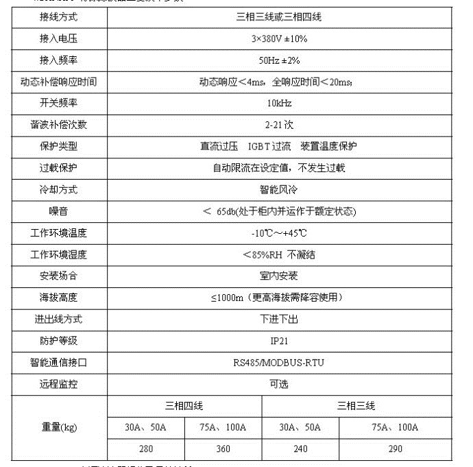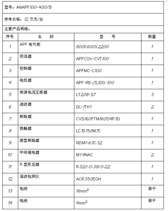 4.1 ANAPF有源濾波器主要技術特點 DSP+FPGA全數字控制方式,具有極快的響應時間 ;先進的主電路拓撲和控制算法,精度更高、運行更穩定;一機多能,既可補諧波,又可兼補無功;模塊化設計,便于生產調試;便利的并聯設計,方便擴容;具有完善的橋臂過流、保護功能;使用方便,易于操作和維護。 4.2 ANAPF有源濾波器主要技術參數
