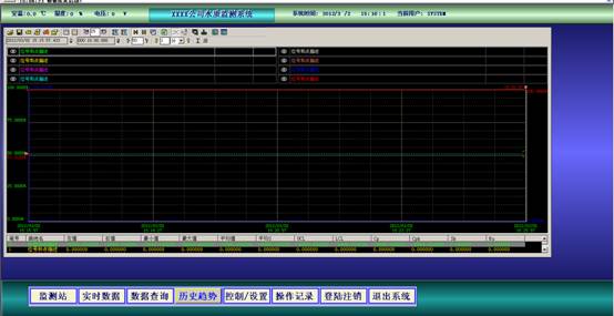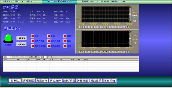 實時數(shù)據(jù)畫面:匯總用戶關(guān)心的所有數(shù)據(jù),重要數(shù)據(jù)以曲線形式實時顯示。在下面的表格中,可以顯示近一段時間內(nèi)的報警。可對當(dāng)前報警進(jìn)行確認(rèn)。