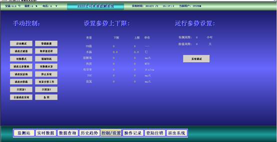 手動控制:在系統(tǒng)完成的一個流程中,內(nèi)部又分為若干的子流程。在間歇時段(非流程運(yùn)行時段),可以啟動一些獨立的子流程(比如清洗管路,除藻等)。如果系統(tǒng)在運(yùn)行時發(fā)生緊急情況,可以執(zhí)行強(qiáng)制停機(jī)等動作。